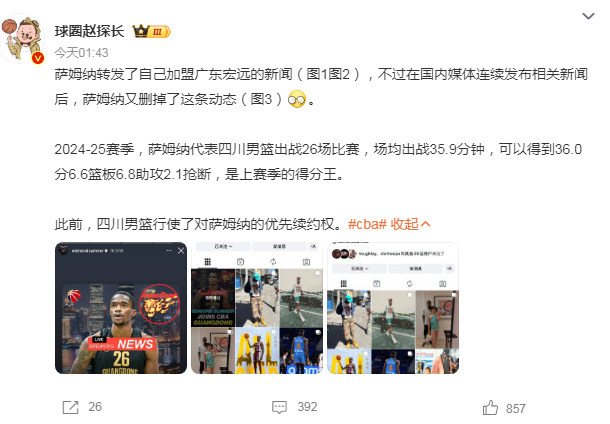 如今根据chnhoops报道,萨姆纳加盟广东男篮。四川男篮保留了萨姆纳的外援优先续约权,但四川男篮显然今夏陷入困境,他们将外援优先续约权交易给广东男篮也不难理解。萨姆纳本人转发了该报道,但在国内媒体连续报道后,萨姆纳目前已删除了如此动态。
